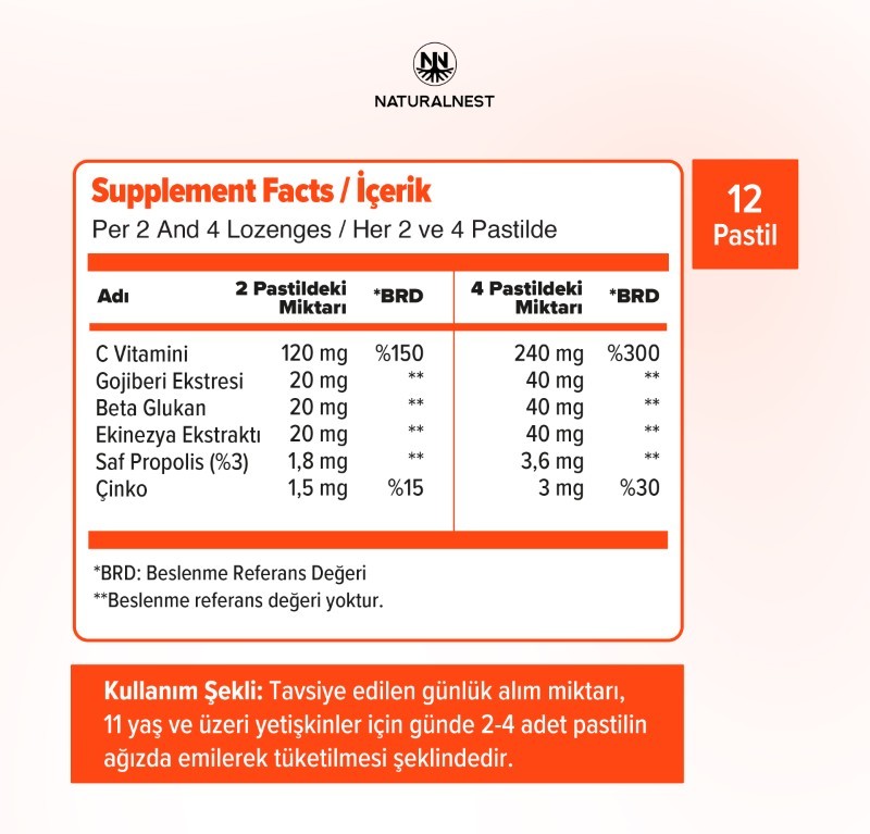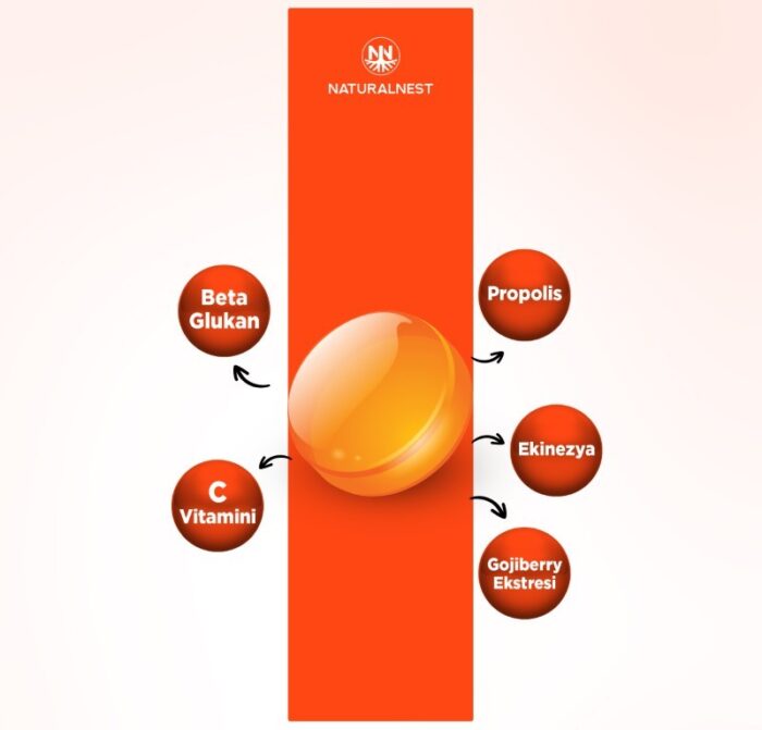 NaturalNest Pastil Defence her sert pastilde; 60 mg C Vitamini, 0.9 mg Saf Propolis, 10 mg Gojiberry Ekstresi, 10 mg Beta Glukanve 10 mg Ekinezya, 0,75 mg Çinko içerir.