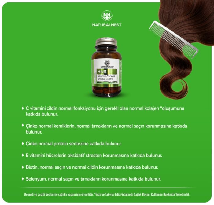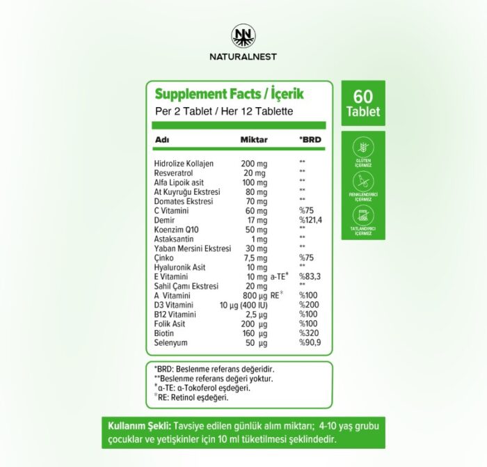 NaturalNest HNS tablet consist of type I contains hydrolyzed collagen, astaxanthin from Haematococcus Pluvialis freshwater microalgae, alpha lipoic acid, resveratrol, hyaluronic acid, coenzyme Q10, lycopene, maritime pine extract, blueberry extract, horsetail extract, vitamins and minerals.