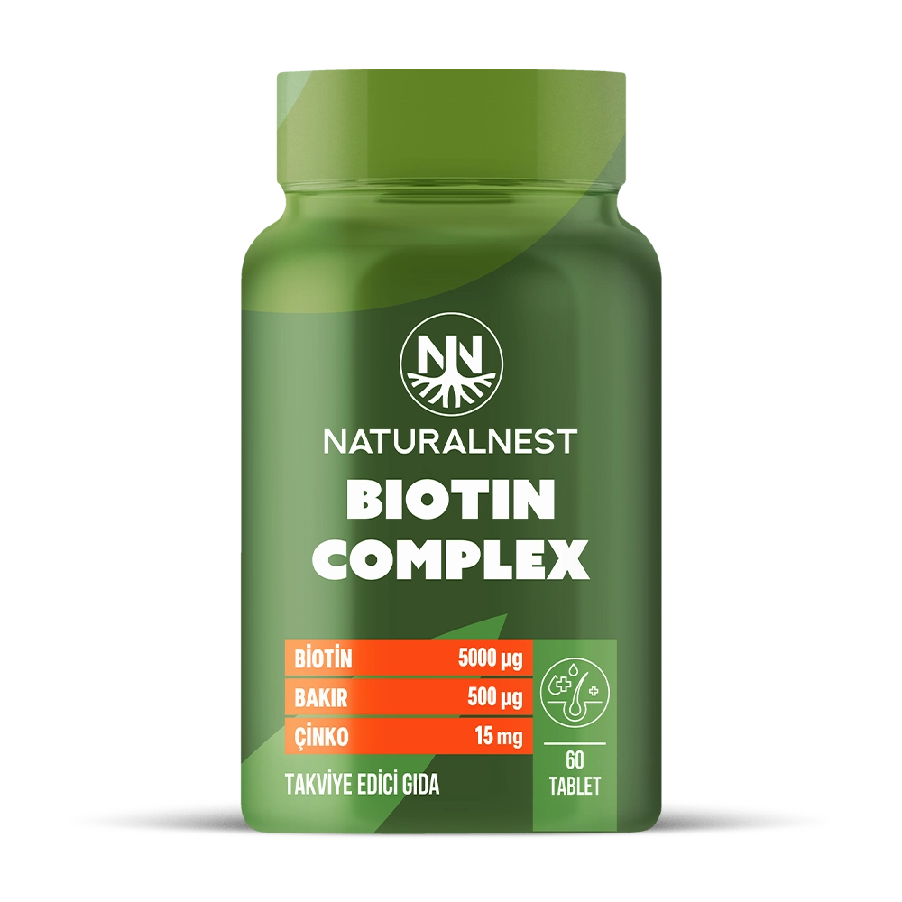 NaturalNest Biotin Complex her tablette 5000 ug Biotin 15 mg Çinko, 6 mg B6 Vitamini, 500 ug Bakır, 55 ug Selenyum, 25 ug D3 Vitamini içermektedir.