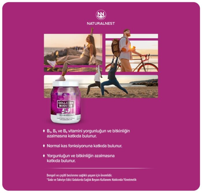 NaturalNest Collagen Booster 5 in 1, toz formdadır, her bir ölçekte (30 gr) 10.000 mg kolajen peptit içermektedir(Tip1-2-3-5-10). Bir ölçek (30 gr) içerisinde ayrıca Glisin, C vitamini bulunmaktadır. 1000 mg ekstra Glisin ile kolajen içeriği desteklenmiştir. Sığır kaynaklı tip 1 -3 kolajen içerir. Vanilya aromasıyla lezzetli içim sağlar.