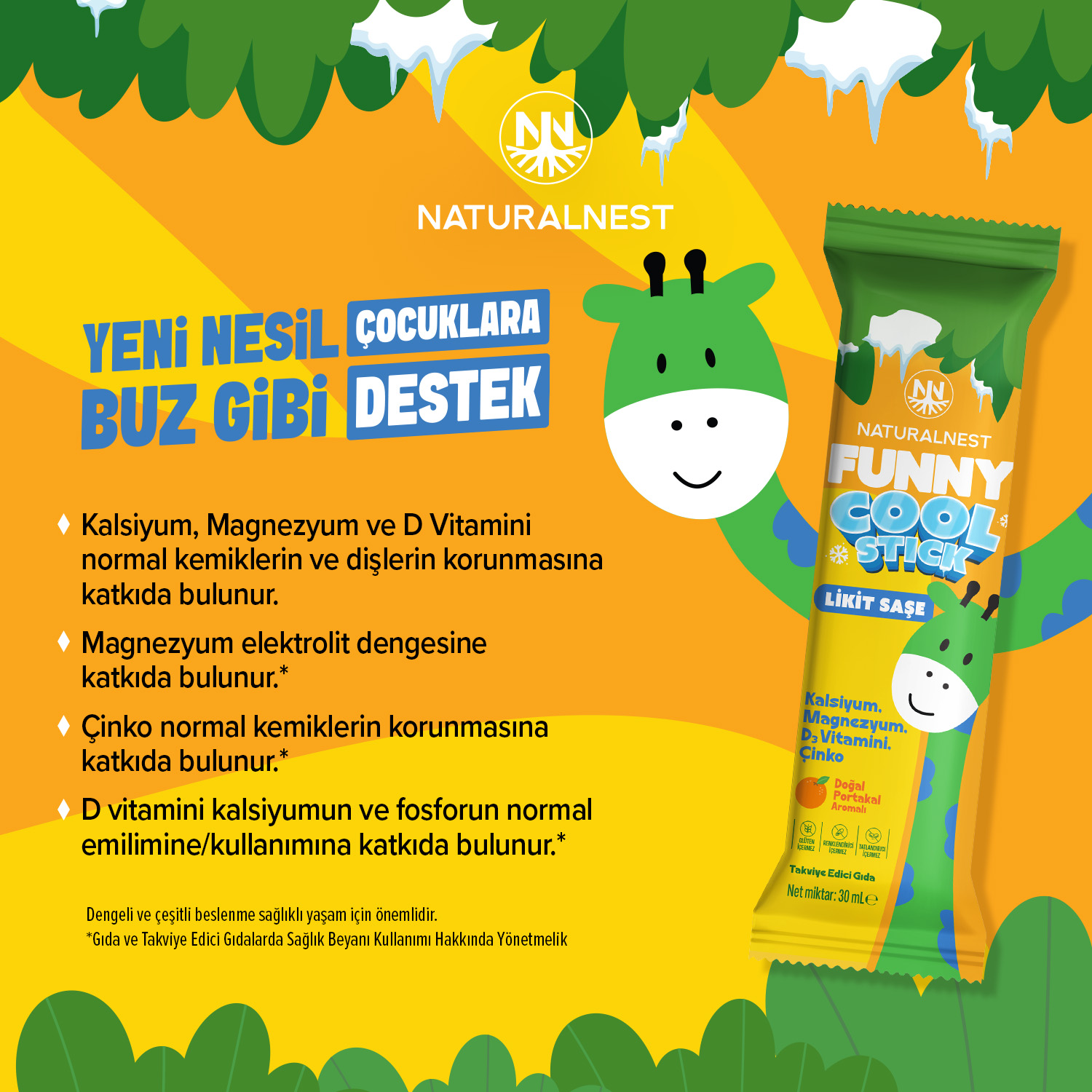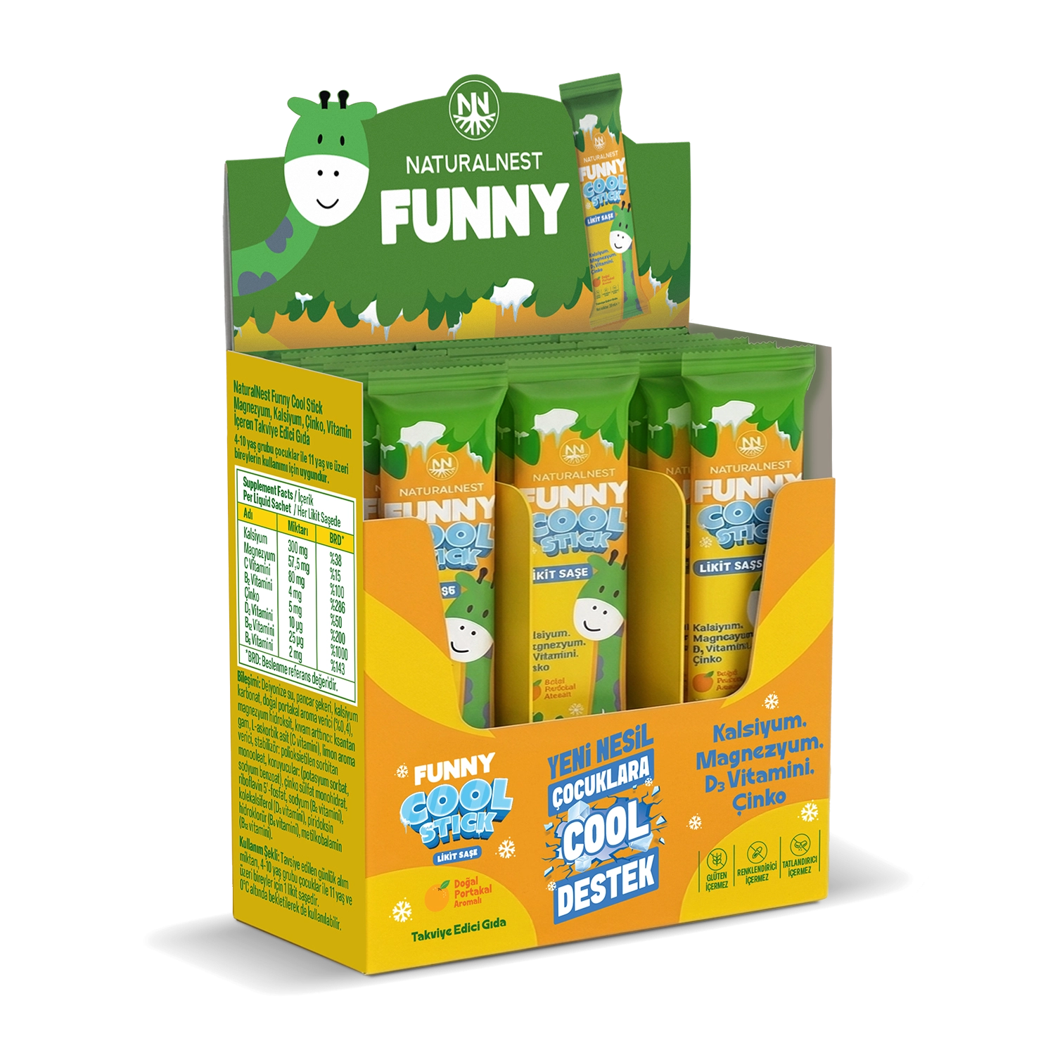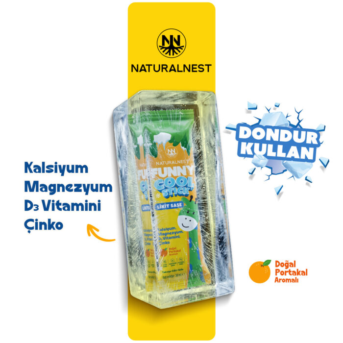NaturalNest Cool Stick Likit Saşe; Kalsiyum, Magnezyum, B vitaminleri, Çinko ve D3 vitamini içeren likit saşe formda bir gıda takviyesidir. Portakal aroması ile lezzetli bir deneyim sunar.