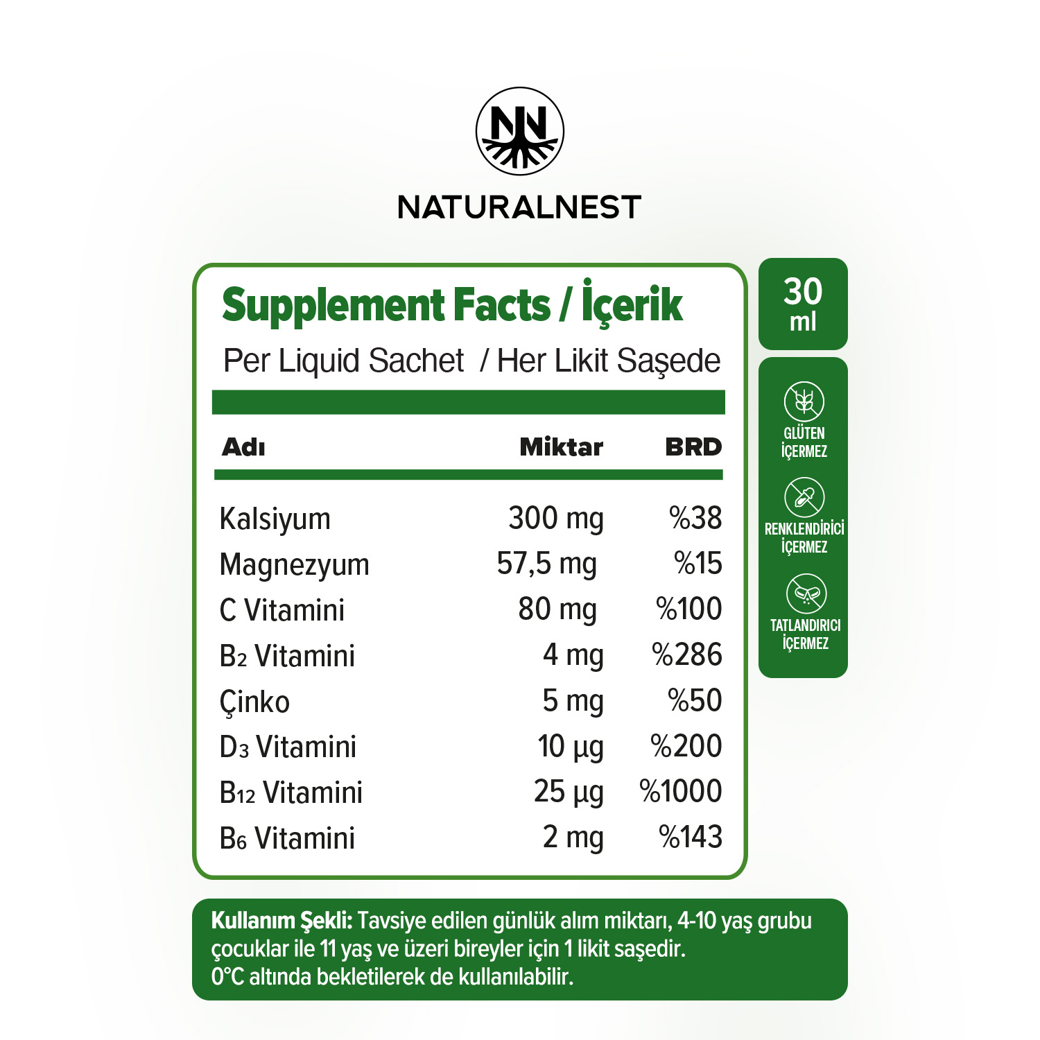 Kullanım Şekli: Tavsiye edilen günlük alım miktarı, 4-10 yaş grubu çocuklar ile 11 yaş ve üzeri bireyler için 1 likit saşedir. 0 derecenin altında bekletilerek de kullanılabilir.