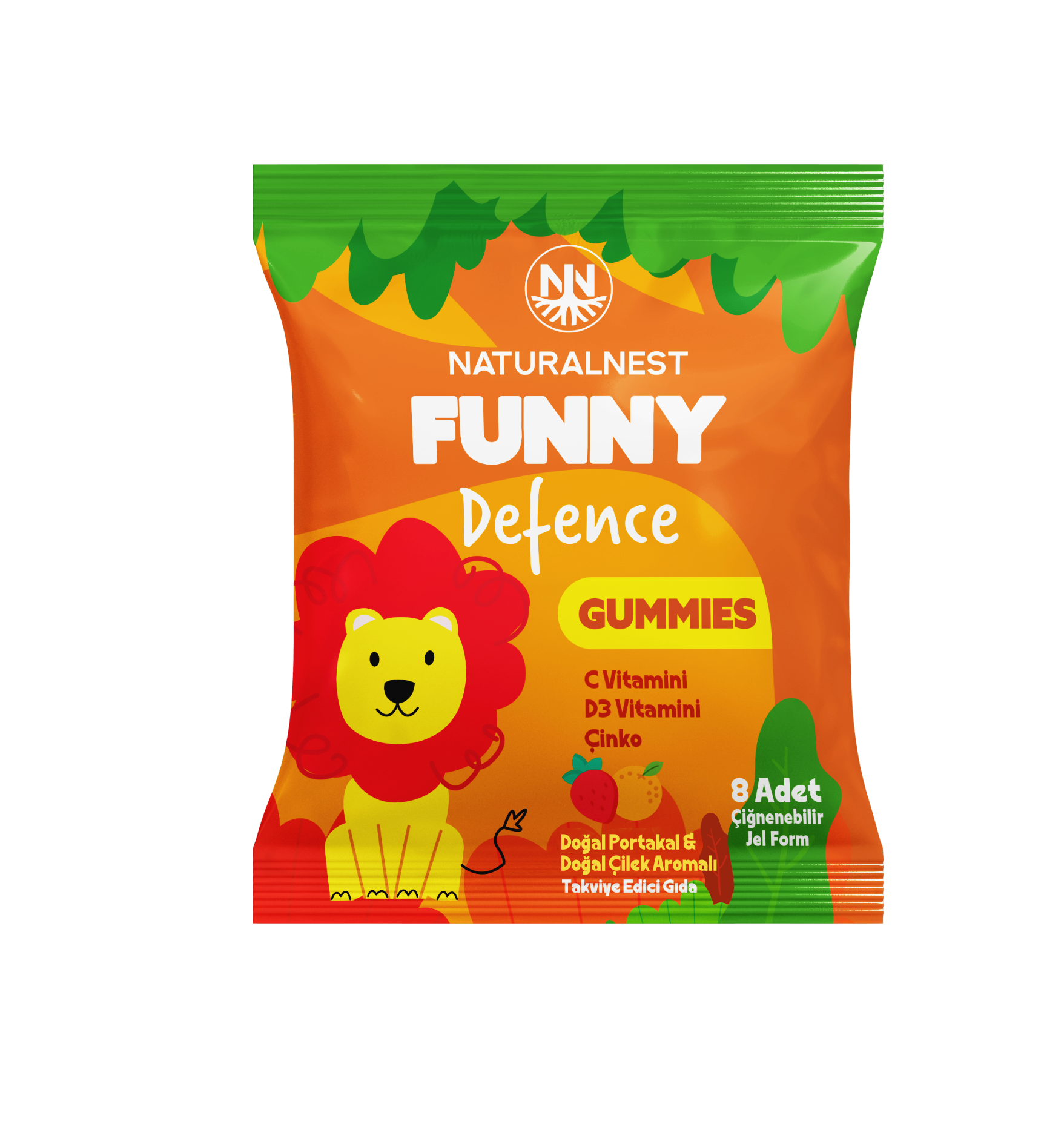 NaturalNest Funny Defence Gummies; C vitamini, çinko ve D3 vitamini içeren çiğnenebilir jel formda bir gıda takviyesidir. Portakal ve çilek aroması ile lezzetli bir deneyim sunar.