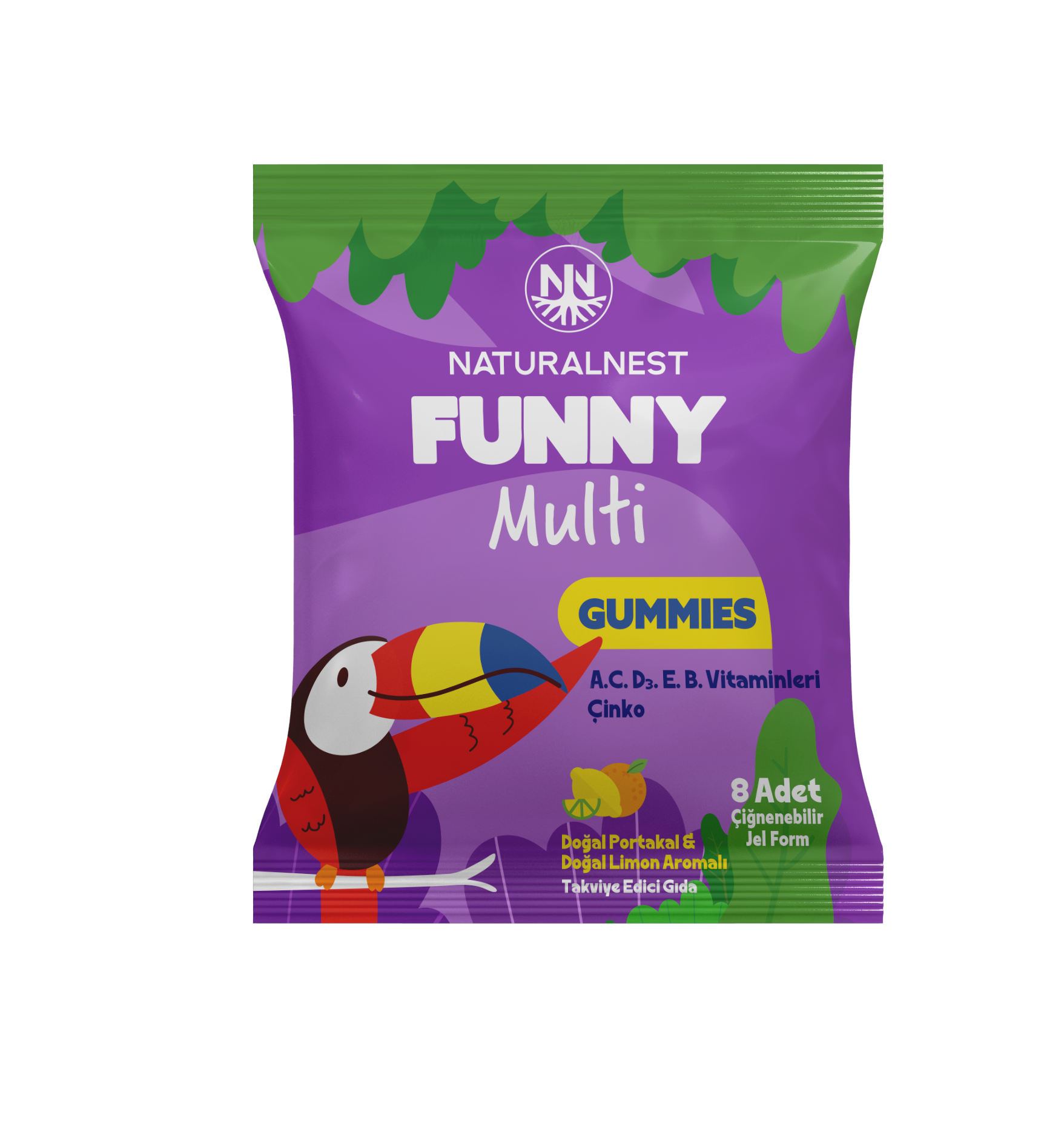 NaturalNest Funny Multi Gummies; C vitamini, çinko, B vitaminleri, A vitamini, E vitamini ve D3 vitamini içeren çiğnenebilir jel formda bir gıda takviyesidir. Portakal ve limon aroması ile lezzetli bir deneyim sunar.