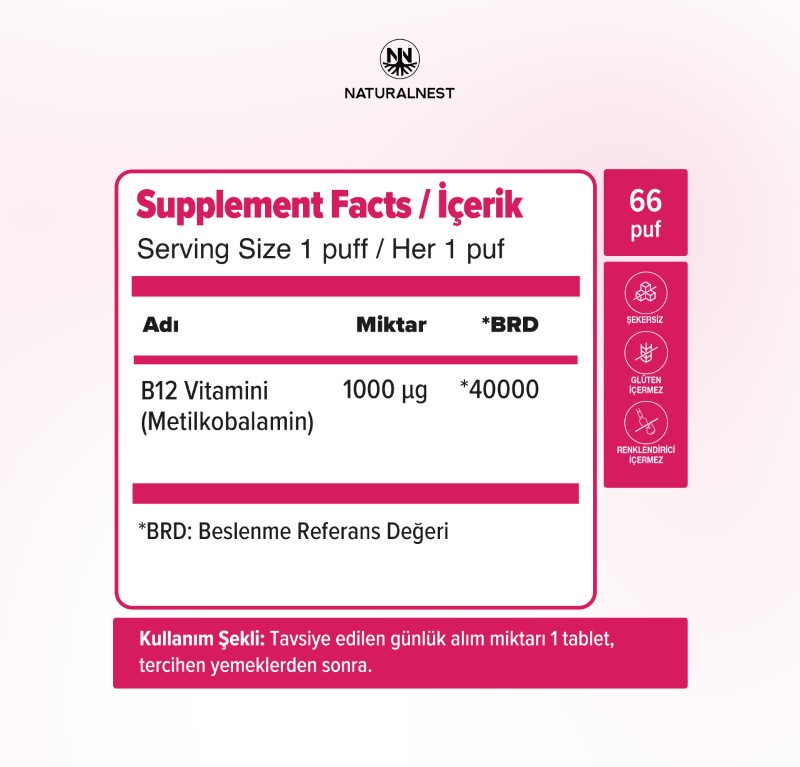 Tavsiye edilen günlük alım miktarı, 4-10 yaş grubu çocuklar ve yetişkinler için dilaltına 1 püskürtme şeklindedir. NaturalNest Methyl B12 sprey dilaltına püskürtüldükten sonra 45 saniye beklenir ve ardından yutulur. NaturalNest B12’nin her pufu 3 damlaya denk gelmektedir.