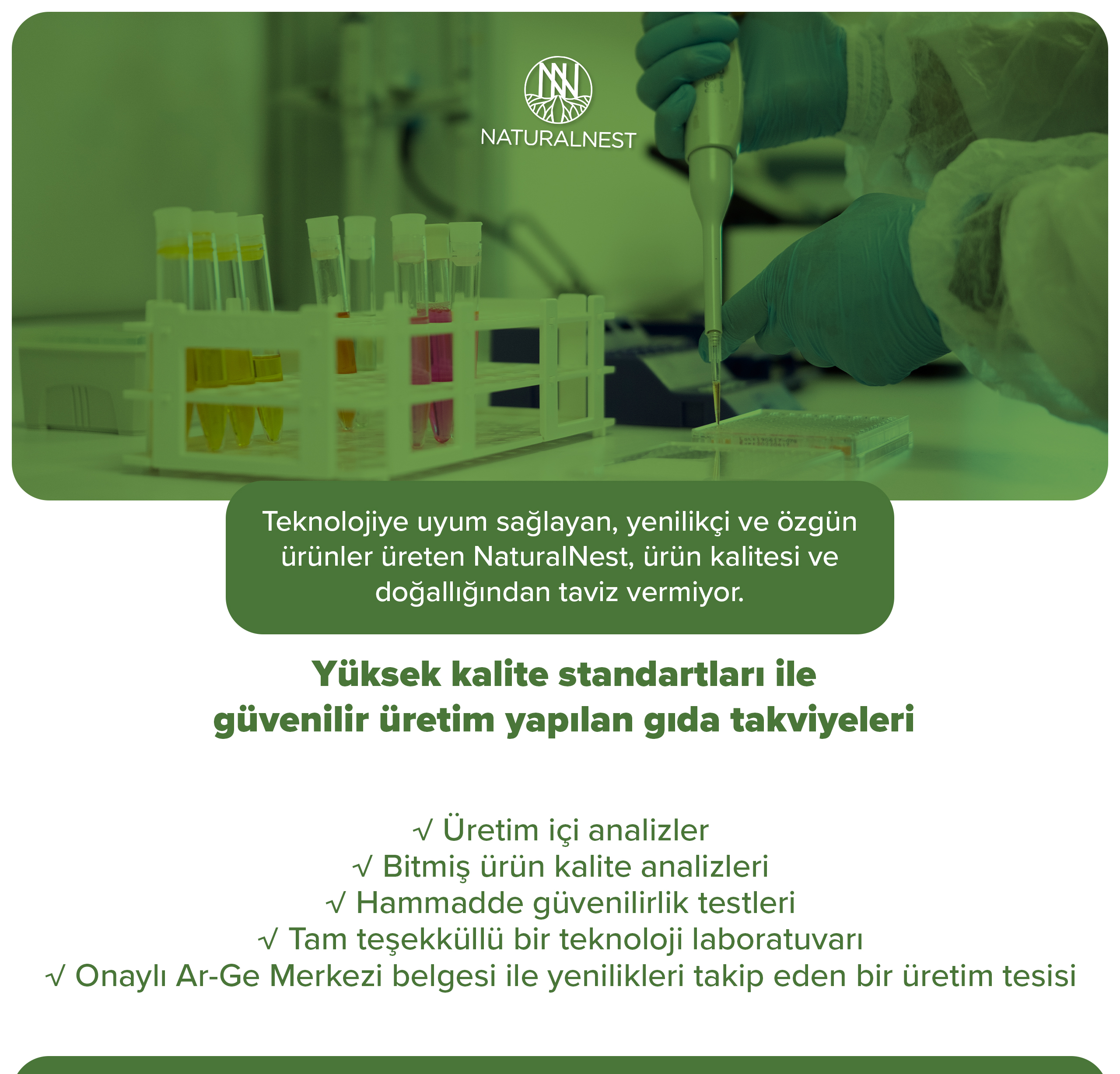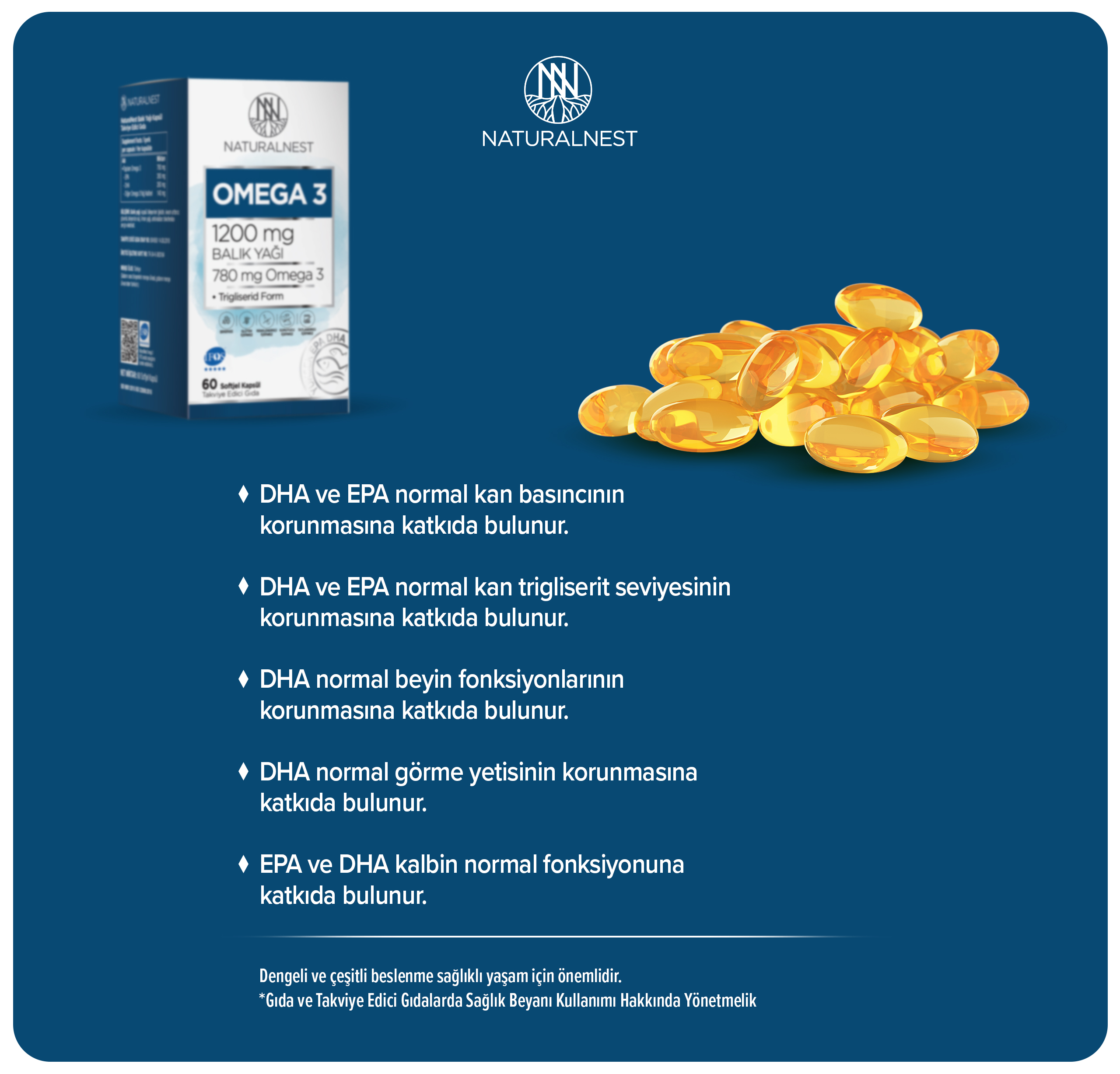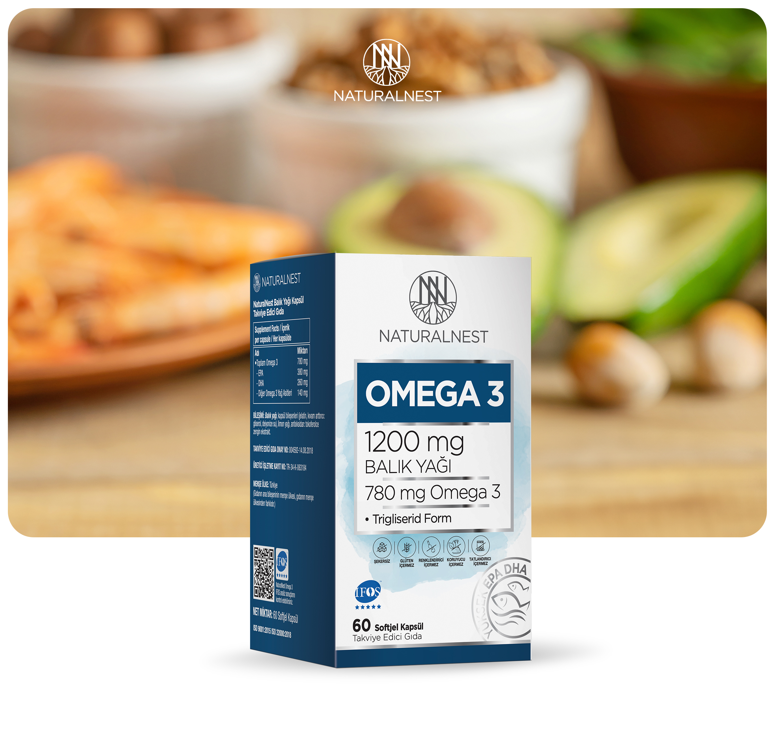 780 mg toplam omega 3, 380 mg EPA, 260 mg DHA içerir. Soğuk denizlerde yaşayan, ağır metallerden uzak küçük balıkların gövde yağlarından elde edilmiştir. Üretim esnasında mekanik yöntemler kullanılmıştır. Trigliserid formu ile NaturalNest Omega 3 her üretim serisinde; saflık, tazelik, içerik garantisi ve kalite parametrelerince yeterli bulunur, bu sayede IFOS 5 yıldız kalite onayına sahiptir.