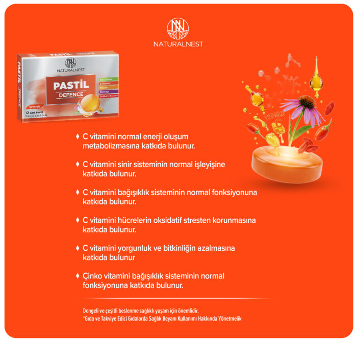 NaturalNest Pastil Defence her sert pastilde; 60 mg C Vitamini, 0.9 mg Saf Propolis, 10 mg Gojiberry Ekstresi, 10 mg Beta Glukanve 10 mg Ekinezya, 0,75 mg Çinko içerir.