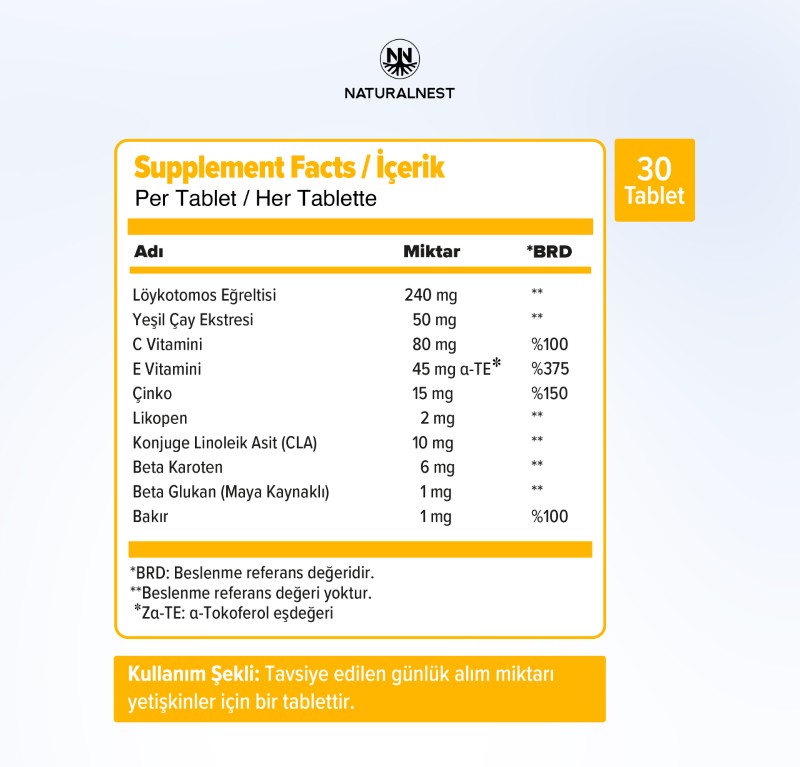 Polypodium Leucotomus, beta karoten, 1,3/1,6 beta glukan, likopen, yeşil çay ekstresi, konjuge linoleik asit, C vitamini, E vitamini, bakır ve çinko bileşenlerinden oluşmaktadır.